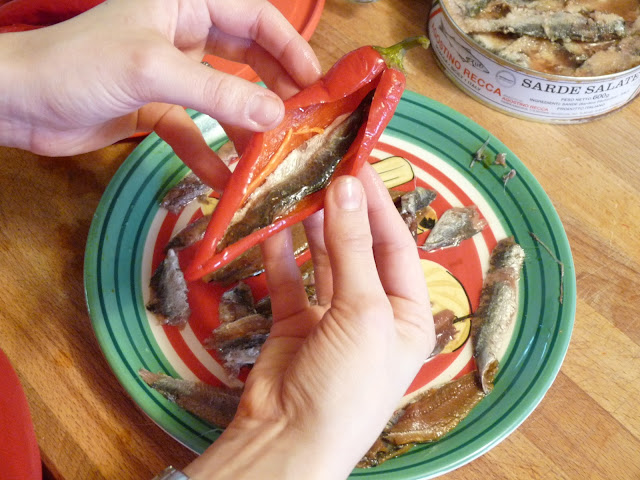 After two days, drain the peppers and rinse them again so they’re not too vinegary; pat dry. Then rinse and debone the anchovies. Prepare one anchovy fillet for each pepper (or more if you’d like, but too much can be overwhelming). Stuff each pepper with an anchovy fillets to fill the length of the pepper.