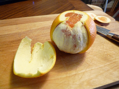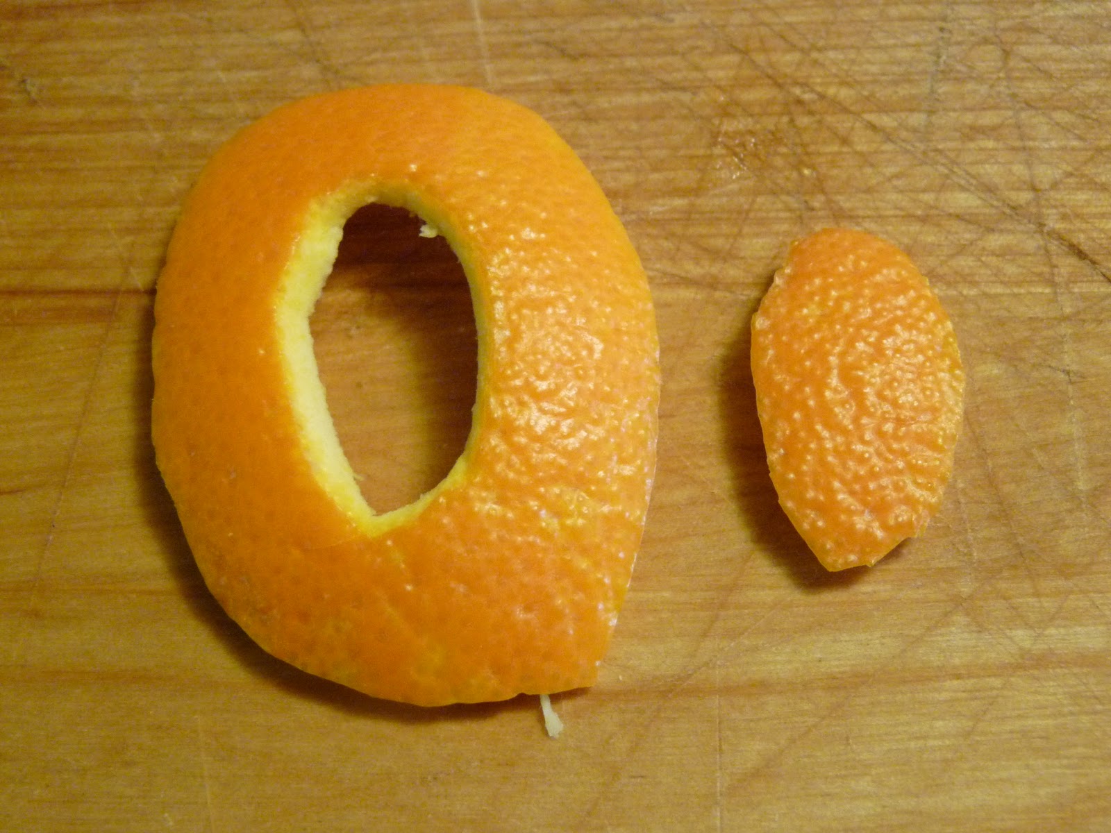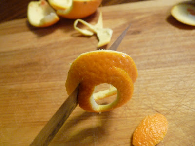Then, the hard part: To be completely honest, I don’t know exactly how this part is done. I’ve gone through four oranges trying to duplicate her technique and only got it twice. Both times, I don’t know what I did, exactly. It sort of just happened. All I know is that she runs the knife’s tip through the perimeter of the O, almost slicing it into two separate rings but stopping about halfway.